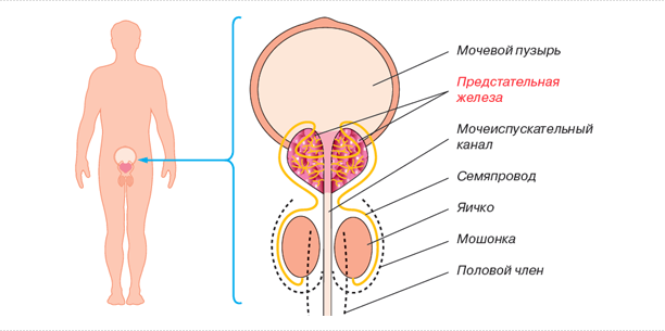 Предстательная железа - это маленькая эластичная железа размером с шарик для пинг-понга. Она находится под мочевым пузырем и перед прямой кишкой.